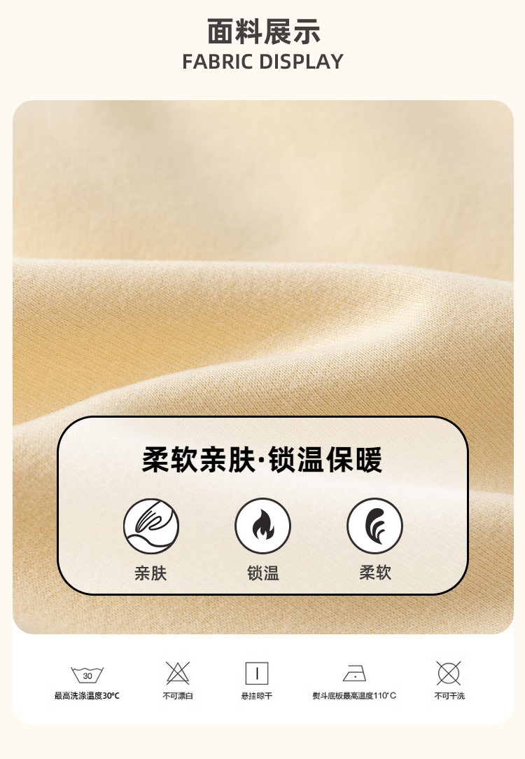 洗涤说明: 1.最高洗涤温度30℃ 常规程序 2.不可漂白 3.悬挂晾干 4.熨斗底板最高温度110℃
