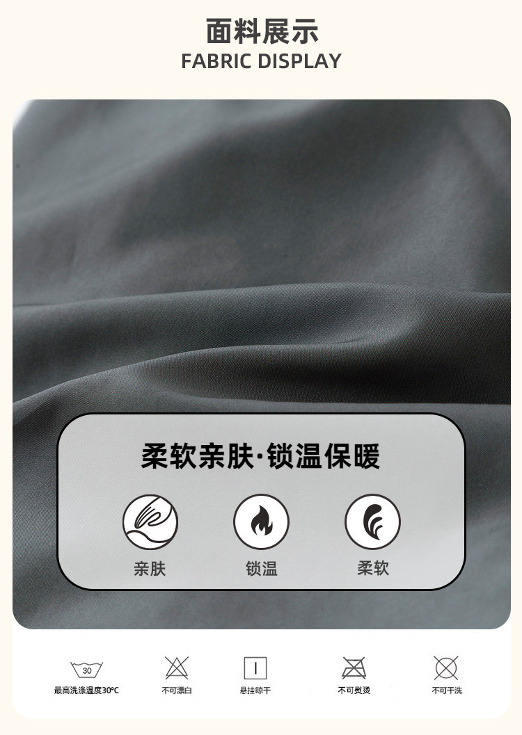 洗涤说明: 1.最高洗涤温度30℃ 常规程序 2.不可漂白 3.悬挂晾干 4.不可熨烫 5.不可干洗